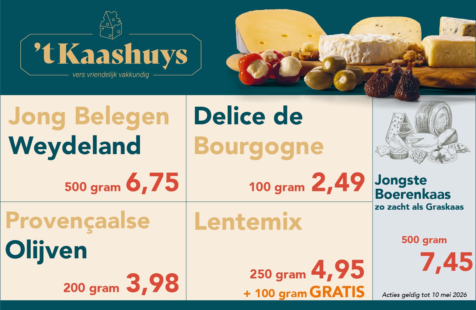 De slogan van ‘t Kaashuys is al jaren “Vers, Vriendelijk en Vakkundig”. Ons doel is om je te laten genieten van ambachtelijke kwaliteit en van producten die passen bij jouw smaak.